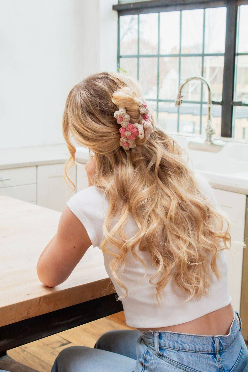 Pink Flower Crochet Cover Large Hair Claw Clip