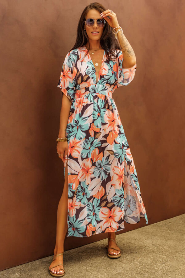 Abito meraviglioso con la scollatura molto aperta e profonda. Bellissimo il contrasto fra i colori dei fiori di questo arancio e azzurro su sfondo nero. Spacchi su entrambi i lati piuttosto alti, manica ampia a campanella. Alcuni pezzi sono già disponibili subito. 100% poliestere