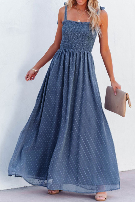 Abito con corpino arricciato, spalline con fiocco ,gonna lunga con spacco laterale. Fodera sottostante per evitare le trasparenze. Stampa a pois.
