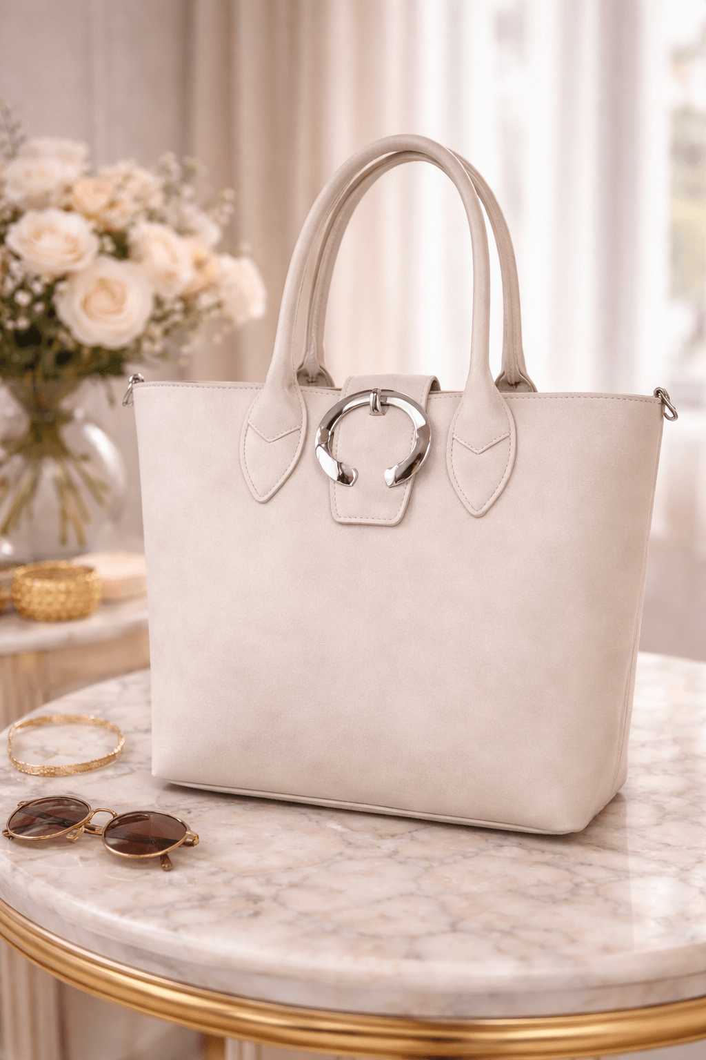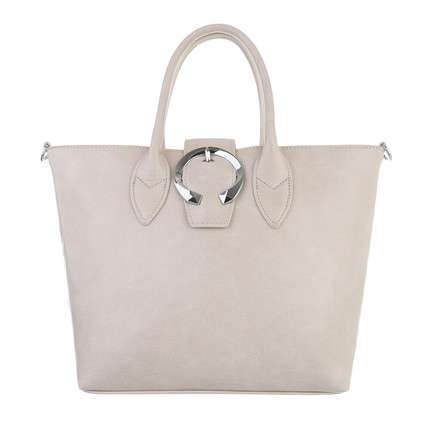 Borsa in colore neutro grigio chiaro, con fibbia decorativa sul fronte e manici ampi, con anelli sui lati per permettere la tracolla. Un colore molto portabile e sfruttabile su diversi look.