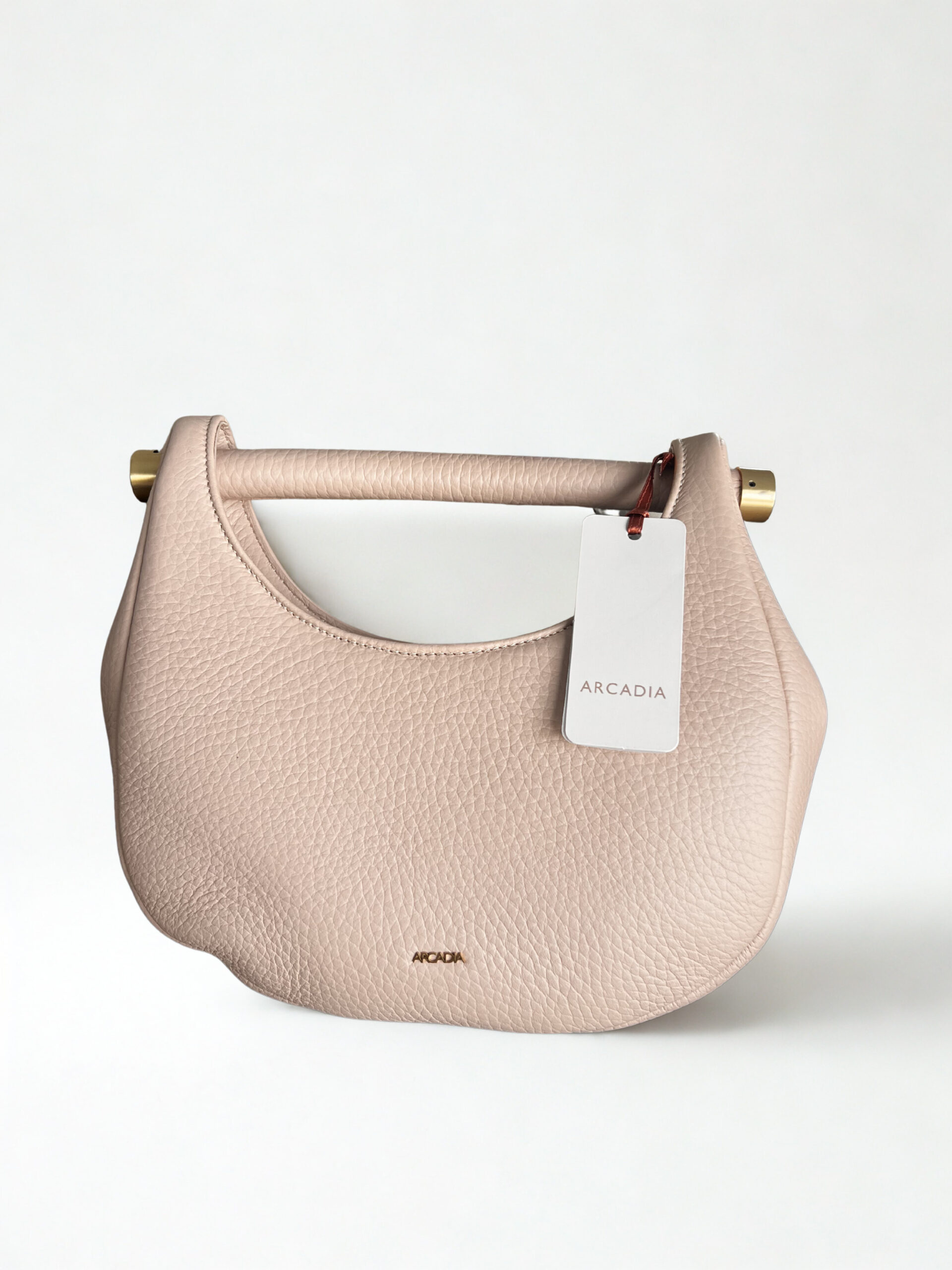 Questa borsa di ridotte dimensioni, ha il caratteristico taglio a semicerchio, e il manico molto particolare perchè è dritto. Disponibile in due varianti colore, con taschina interna portatrucco e doblone di riconoscimento all’interno, con scritta sulla parte frontale. Chiusura con cerniera, piedini proteggi base e possibilità di aggiungere la tracolla. La tonalità rosa è un cipria