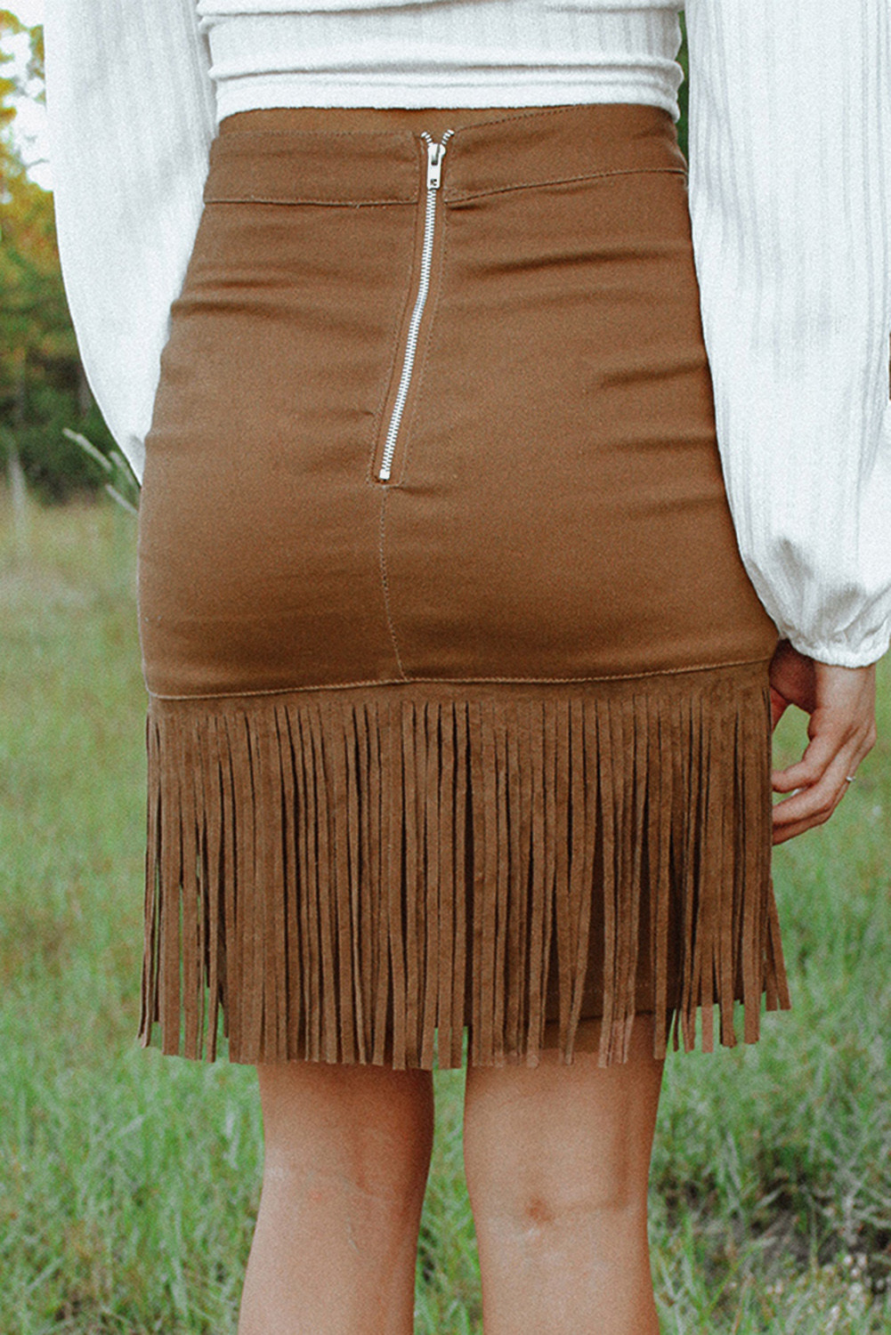 Una bellissima gonna per autunno- inverno, con tasche decorative sui due lati, forma tubino con risvolto sull’orlo, frange decorative che cadono morbide lungo l’estremità. cerniera sul retro. Forma leggermente arrotondata sul fronte. 90% poliestere, 10% elastene