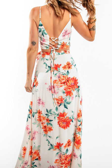 Un bellissimo set composto da top e gonna coordinati, gonna a portafoglio, con voluminoso spacco. Scollatura a v e intreccio sulla schiena a corsetto. Fresco ed estivo.